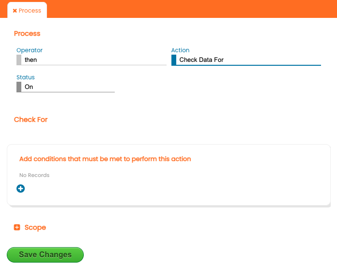 Often your processes will require the ability to perform an action only if certain requirements are met. That is where the "Check Data" action comes in. This action allows the process to perform subsequent actions depending on if the data in the process matches the supplied criteria. The check data will always execute subsequent IF actions when the data matches the criteria. It will always run subsequent ELSE actions when the data does not meet the conditions.